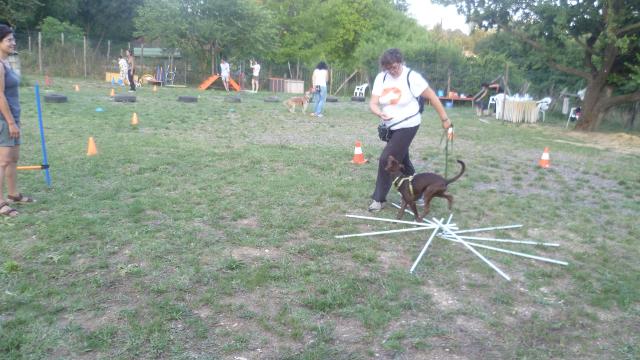 Mentre preparavamo i percorsi finali i cani si sono concessi una breve pausa per bere e riposarsi al fresco, poi di nuovo tutti in campo per verificare quanto appreso in questa giornata al guinzaglio e riprovare qualcosa del laboratorio di pratica sulla Rally Obedience. Ogni binomio ha percorso ciascuno dei due circuiti che comprendevano: camminata al piede, cambi di lato in diverse modalità, stop&go, salti, barriere a terra, resta con distrazione, richiamo al piede, cambi di direzione.