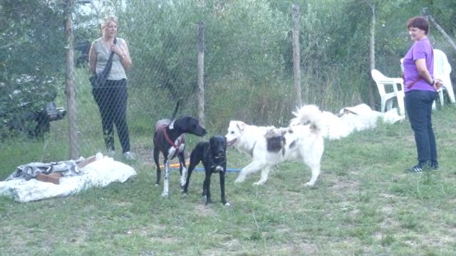 Molte le interazioni di normale comunicazione tra i cani presenti, tutti molto bravi, decido così di aumentare la difficoltà della classe mettendo qualcuno al guinzaglio e lasciando che interagiscano con i cani ancora liberi. Alla fine relax per tutti.
