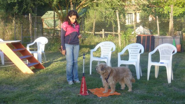 Cluny conosceva già qualcosa di molto simile e il passaggio sotto le gambe non era certo un problema, a volte è più difficile per la persona coordinare bene tutti i movimenti, la mano con cui tengo il guinzaglio, il clicker e il modo in cui offro il bocconcino piuttosto che per il cane dare fluidità al comportamento.
