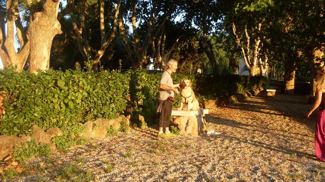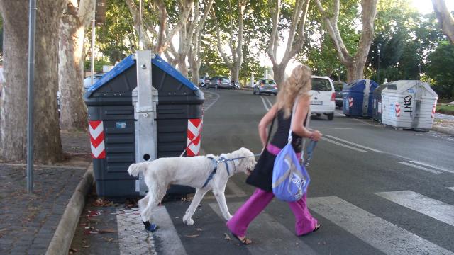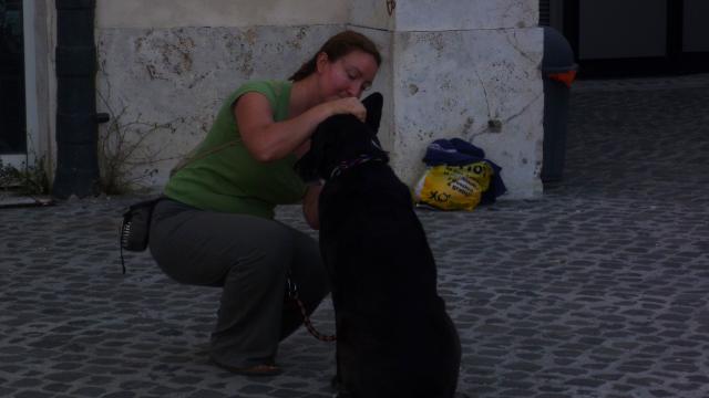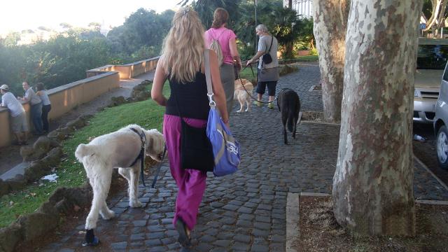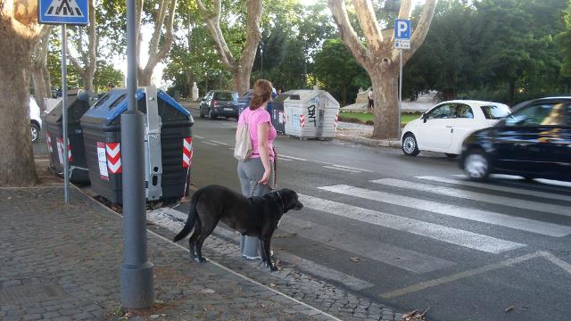 La seconda giornata di prove si è svolta sulle terrazze del Gianicolo per verificare la gestione del cane in strada (prova n° 3). Ci siamo dati appuntamento sulla piazza centrale ed abbiamo fatto un primo giro lontano dalle persone per passare poi sulla terrazza del belvedere affollata di gente. I conduttori hanno dimostrato di saper gestire il cane richiamandone l’attenzione quando necessario. Da lì abbiamo fatto una passeggiata di circa un’ora in cui i proprietari dovevano spostare il cane da un lato all’altro ogni volta che capitasse di incontrare bambini, persone con passeggino, joggers, altri cani al guinzaglio. Durante la passeggiata ci siamo fermati per qualche esercizio di mobility e di problem solving, abbiamo attraversato una strada molto trafficata, abbiamo fermato i passanti per chiedere indicazioni, abbiamo verificato l’affiatamento del binomio chiedendo al conduttore di variare molto la velocità dell’andatura.