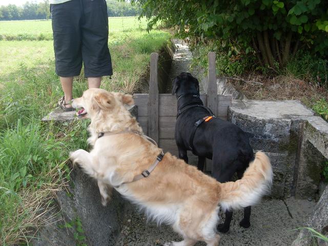 Scegliamo un nuovo percorso in mezzo ai campi, in cerca di un posto dove anche Macchia, che non ama l'acqua, possa rinfrescarsi un po'. Buck e Zoe si lanciano in una grande pozza ma Macchia non gradisce … andiamo oltre e finalmente anche lei fa il bagno, mentre Buck invita l'amica bionda a giocare.
